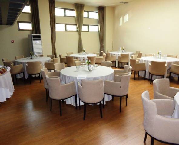 Η όμορφη ατμόσφαιρα της αίθουσας, η οποία διαθέτει ξύλινο δάπεδο, ξύλινες πόρτες και αντίστοιχου χρώματος κουρτίνες είναι ιδανική για μια πετυχημένη εκδήλωση.